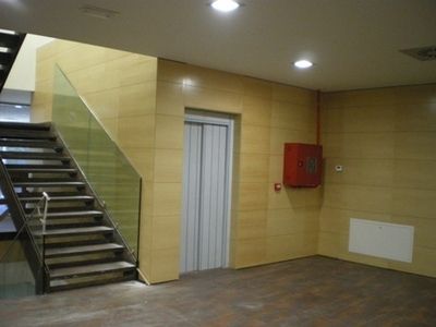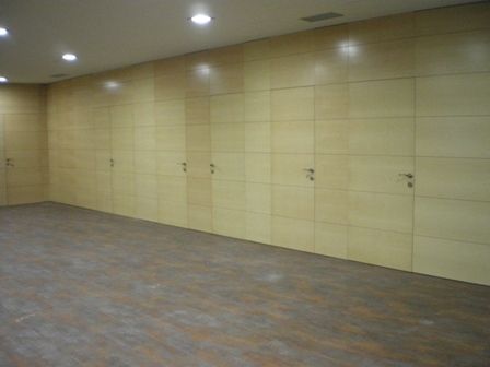 Forro de Pared en madera noble llagas horizontales, integrando las puertas de paso también en llagas, lo que dota a la instalación de elegancia y sutileza, gracias a la precisión de los trabajos. En primer lugar se coloca rastrel DM hidrófugo, a continuación se instala los tableros de madera barnizada, aportando un ambiente cálido dentro del entorno del trabajo.